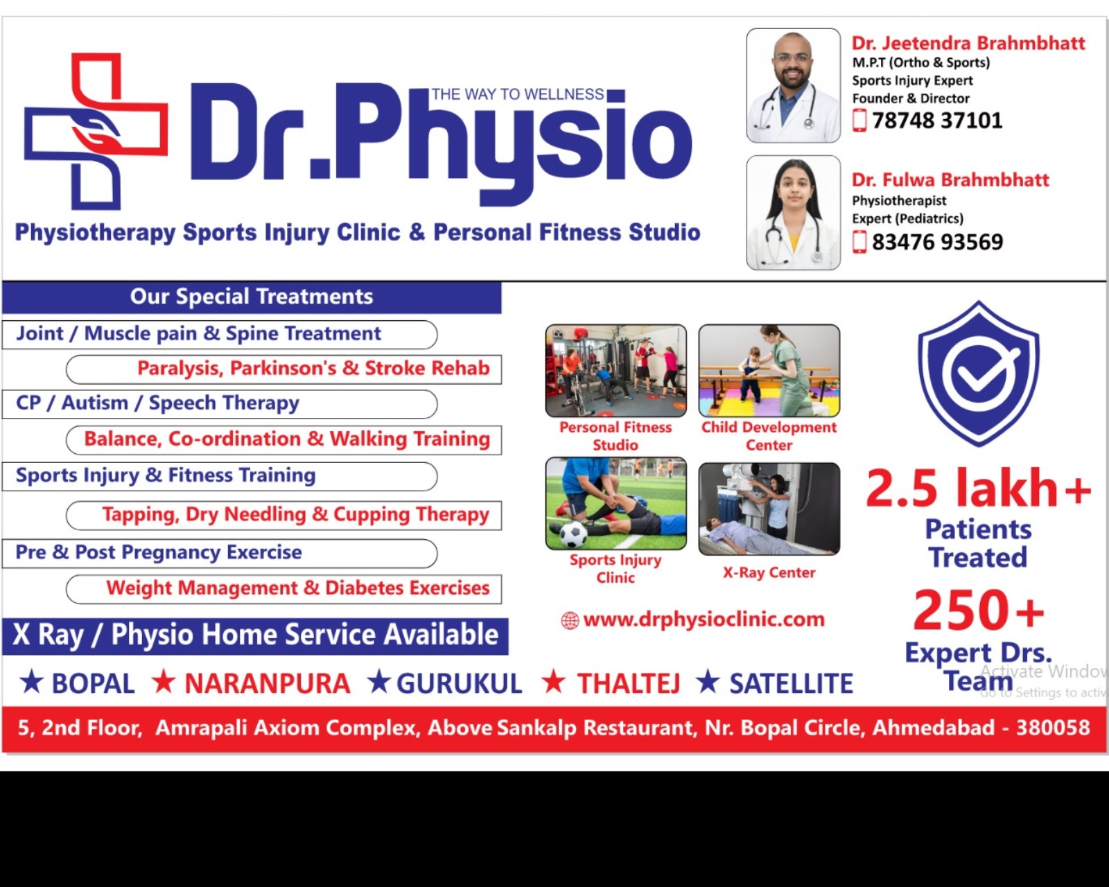 Many people live with pain for days, weeks, and even months… They adjust their lifestyle, change their habits, stop activities they love, and hope the pain will “go away.” But the truth is: Pain becomes worse when you ignore it. It becomes better when you treat it at the right place. And that is exactly what we do at Dr. Physio Clinic. 🔹 Why People Trust Us At our clinic, we don’t just give best treatment, but We understand your problem, your routine, your comfort level, and what your body really needs. People choose us because they want: ✔ Real results ✔ Personal attention ✔ Safe and effective physiotherapy ✔ A clinic where they feel cared for ✔ A proper plan to recover step by step When you come to us, you feel the difference from Day 1. 🔹 How Your Visit Helps You When you visit Dr. Physio Clinic, you will experience: ✨ Less pain ✨ Better movement ✨ More confidence in your body ✨ Clear guidance ✨ A treatment plan made only for YOU ✨ Support at every step You will realize that you should have taken this step earlier—because recovery feels GOOD. ⭐ WHAT WE TREAT at DR. PHYSIO CLINIC ⭐ ✔ Back Pain • Slip Disc • Sciatica • Muscle Spasm • Posture Pain ✔ Neck Pain • Cervical Spondylosis • Stiff Neck • Nerve Compression ✔ Knee Pain • Arthritis • Meniscus Issues • Ligament Strain ✔ Shoulder Pain • Frozen Shoulder • Rotator Cuff Injury • Shoulder Stiffness ✔ Sports Injuries • Ankle Sprain • Muscle Tear • Ligament Injury ✔ Post-Fracture & Post-Surgery Rehab • Stiffness • Weakness • Mobility Recovery ✔ Parkinson’s Physiotherapy • Balance Issues • Walking Difficulty • Body Stiffness ✔ Special Child Physiotherapy • Cerebral Palsy • Developmental Delay • Autism (Motor Training) ✔ General Problems • Muscle Weakness • Joint Stiffness • Heel Pain / Plantar Fasciitis • Tennis Elbow / Golfer’s Elbow ⭐ WHAT WE TREAT at DR. PHYSIO CLINIC ⭐ ✔ Back Pain • Slip Disc • Sciatica • Muscle Spasm • Posture Pain ✔ Neck Pain • Cervical Spondylosis • Stiff Neck • Nerve Compression ✔ Knee Pain • Arthritis • Meniscus Issues • Ligament Strain ✔ Shoulder Pain • Frozen Shoulder • Rotator Cuff Injury • Shoulder Stiffness ✔ Sports Injuries • Ankle Sprain • Muscle Tear • Ligament Injury ✔ Post-Fracture & Post-Surgery Rehab • Stiffness • Weakness • Mobility Recovery ✔ Parkinson’s Physiotherapy • Balance Issues • Walking Difficulty • Body Stiffness ✔ Special Child Physiotherapy • Cerebral Palsy • Developmental Delay • Autism (Motor Training) ✔ General Problems • Muscle Weakness • Joint Stiffness • Heel Pain / Plantar Fasciitis • Tennis Elbow / Golfer’s Elbow 📍 Clinic Address Dr. Physio Physiotherapy & Sports Injury Clinic 5, Axiom Amrapali Complex, 2nd Floor, Above SBI Bank, Near Sankalp Restaurant, Bopal, Ahmedabad 📞 For Appointments 8347693569 7874837101 🌐 Visit us at: www.drphysioclinic.com 'Your body wants to heal.'